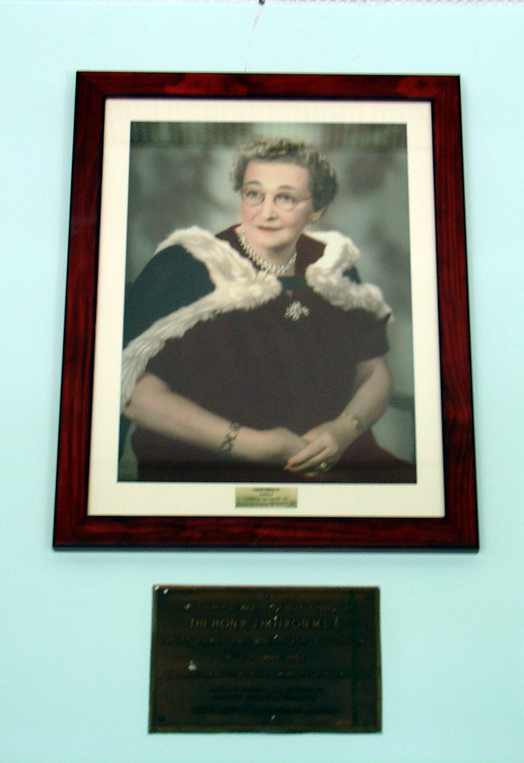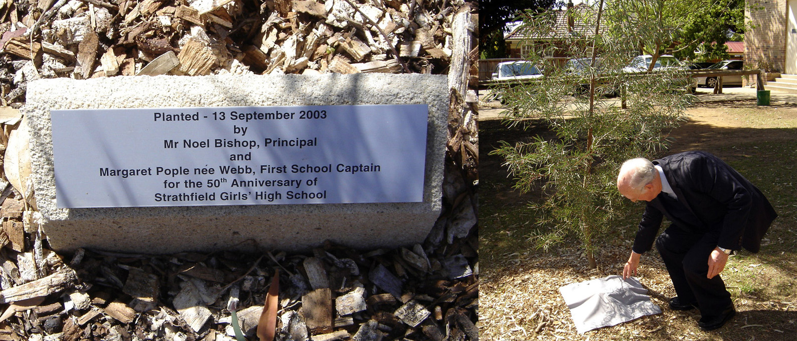 September is the month to commemorate at SGHS. In 1953, a tree was planted to commemorate the founding of the school. The principal at the time was Louise Woodhouse and the school captain was Margaret Webb. To celebrate the Golden Jubilee of the school in September 2003, another tree was planted by the principal Noel Bishop with the aid of Margaret Pople (née Webb). Click here to see the first plaque and Margaret. On 19 September this year a plaque was unveiled for each of these trees. Margaret did the honours for the first tree and Noel Bishop for the second. We are very grateful to Margaret for coming all the way from Port Macquarie for the occasion. We have Monica Foggin (née Harvey) to thank for obtaining the tree plaques for the FSSA. Click here to see the second plaque and Noel Bishop unveiling it. Noelene Doney (née Edmond) was very disappointed at the 50 year celebrations to find there was no portrait of Louise Woodhouse at the school. The FSSA took up her idea and thanks to the efforts of Elaine Norton (née Algie) and her husband John, we were able to hang a portrait of the founding headmistress of SGHS on the wall above the doors to the hall. Bruce Woodhouse, grandson of our Louise Woodhouse, dedicated this gift to the school from the FSSA. Noel Bishop accepted our gift, saying that the school is always seen as belonging to Louise Woodhouse so that all other principals are caretakers striving to keep up her standards. Click here to see the portrait on the wall.